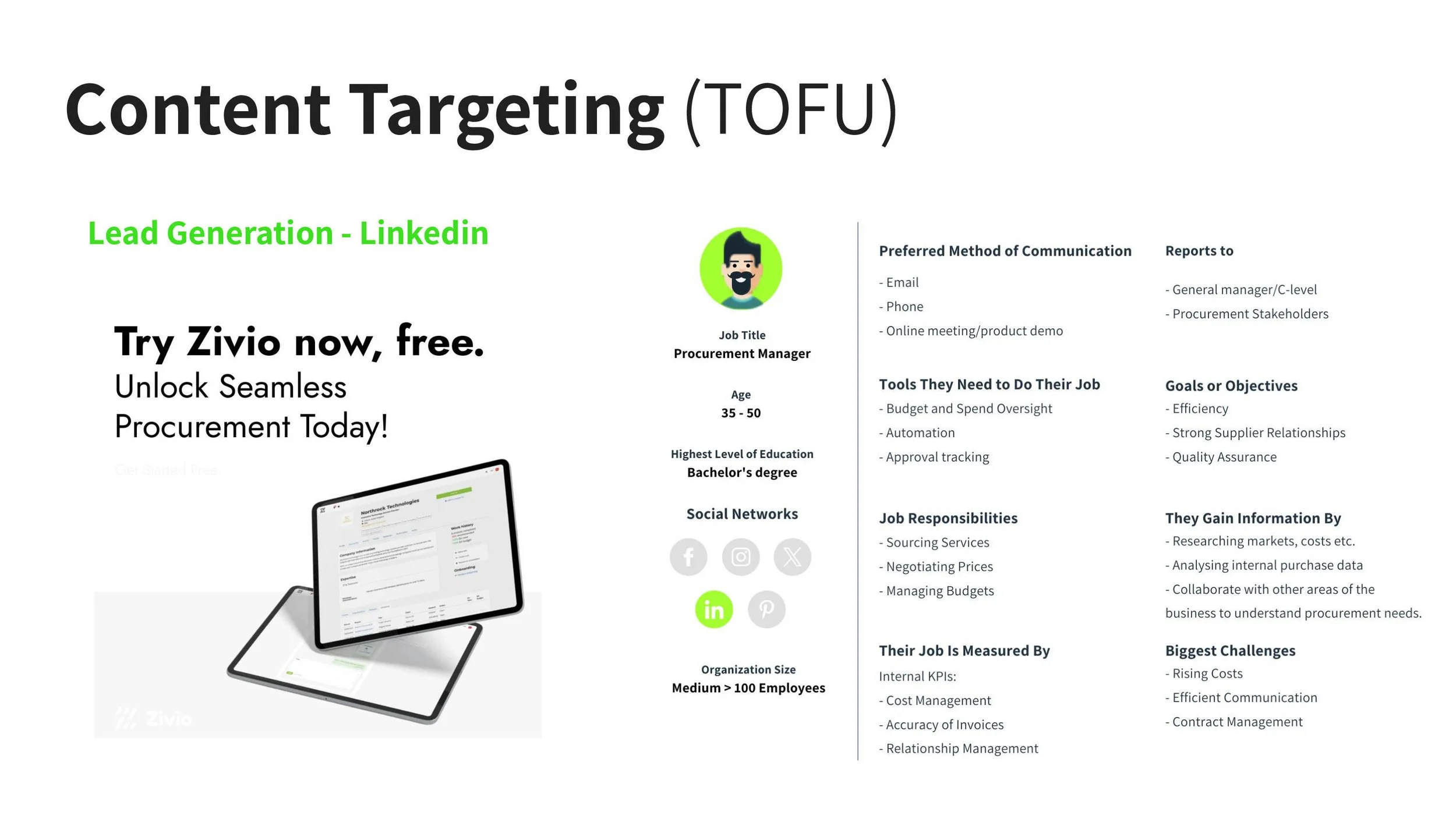 Zivio is a rapidly growing and highly ambitious Procure-tech startup. I had the opportunity to put together and pitch to them a comprehensive marketing strategy including; budget allocation, content designs and a campaign timeline.